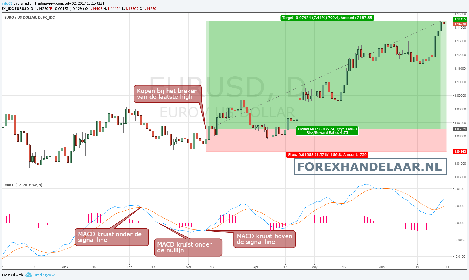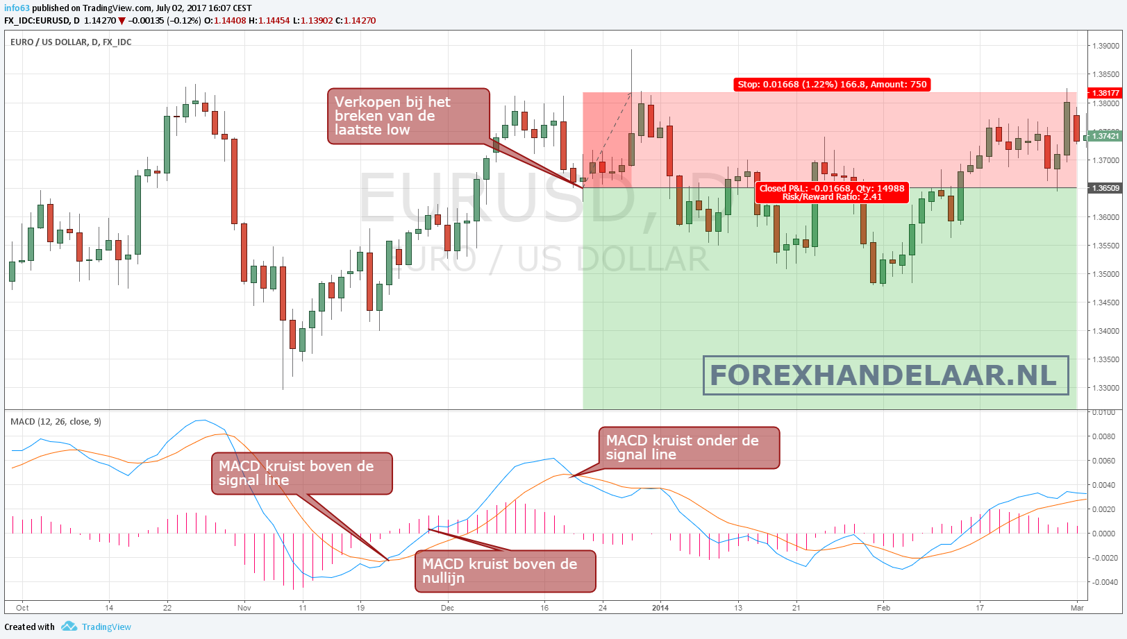 Dit is een 1 dags grafiek van de EURUSD. We zien dat de MACD boven de signal line kruist en vervolgens boven de nullijn uitstijgt. Vervolgens krijgen we een verkoopsignaal bij het terugkruisen van de MACD onder de signal line en verkopen we dit Forexpaar bij het breken van de low van de laatste candle. In dit voorbeeld is de stop loss net boven de laatste swing high geplaatst en worden we een paar candles later uitgestopt.
